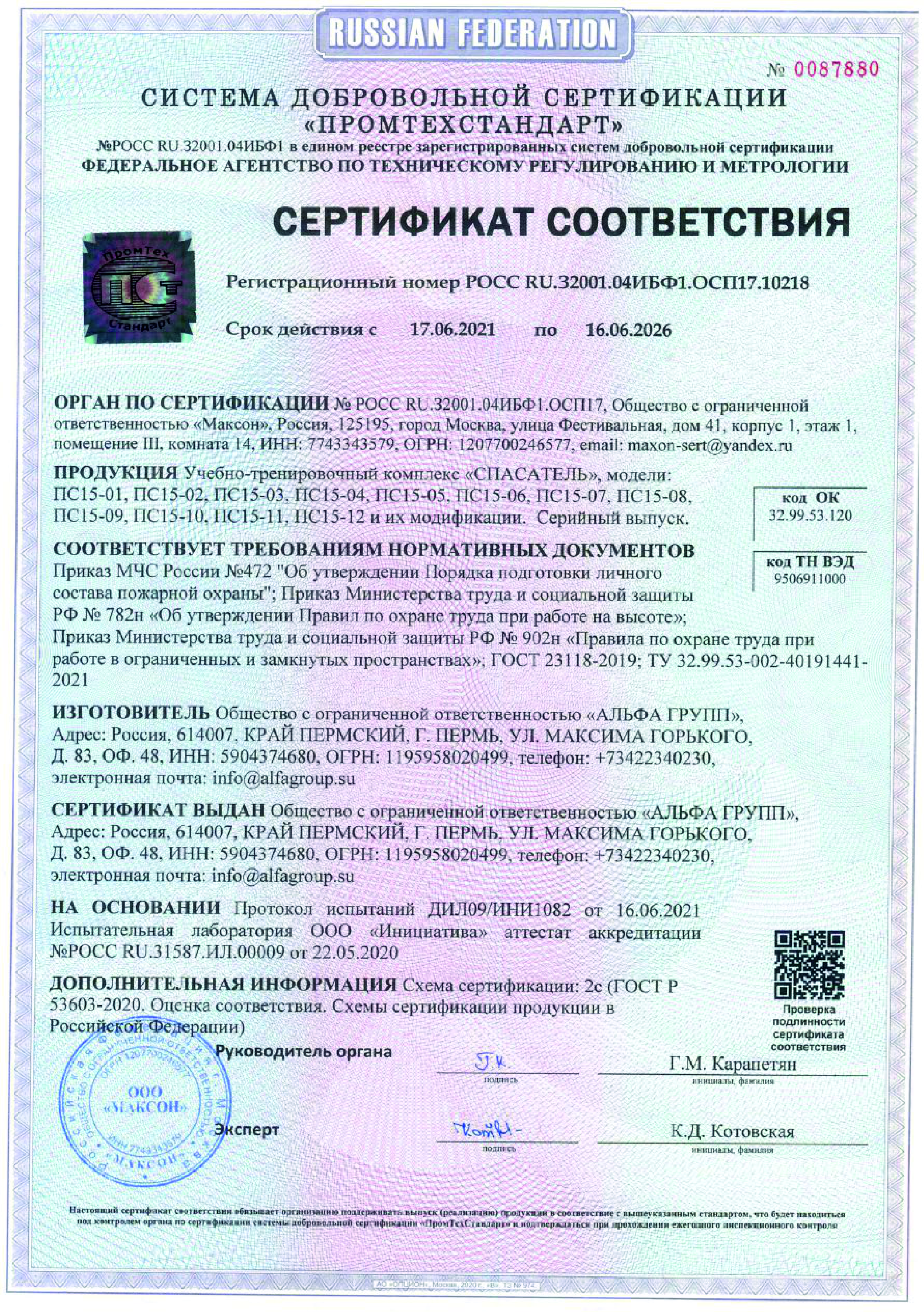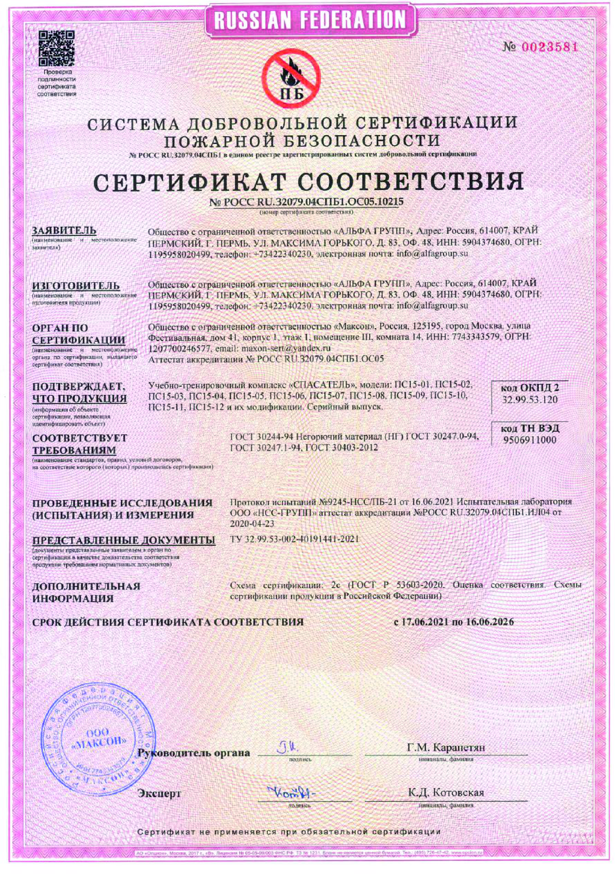 Сертификат ПБ на СПАСАТЕЛЬ до 16.06.2026